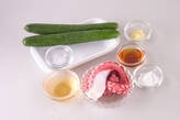 キュウリは両端を切り落とし、縦半分に切りスプーン等で中央の種を削り取り、3cmの長さに切り、塩少々でもむ。