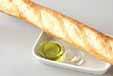 温めておいたオーブントースターでフランスパンを軽く焼き、ニンニクの切り口をパンにこすりつけて香りを付ける。