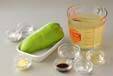 浅ウリは両端を切り落とし、皮をむいて縦半分に切る。スプーン等で中央の種とワタを取り、薄い半月状に切る。