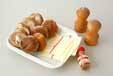 生シイタケは軸を切り落とし、かたく絞ったぬれ布巾で汚れを拭き取る。サッと水洗いした場合はしっかり水気を拭き取って下さい。スライスチーズの場合は1枚を半分に切って半分に折る。