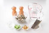 鍋にアサリ、水、昆布、酒を入れて強火にかける。煮立てば昆布を取り出し、アサリの口が開けば火を弱め、アクをとる。