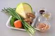 シイタケは汚れを拭き取り、石づきを切り落とし、軸と笠に切り分け、軸は縦に裂き笠は薄切りにする。