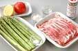 まな板に豚肉を重ならないように広げ、ハーブソルトを振りかけ、薄く小麦粉を振る。グリーンアスパラを芯にして肉を巻き付け、薄く小麦粉をまぶす。