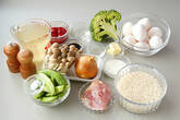 フライパンにバター10gを入れて中火にかけ、バターが溶ければ洗った米を炒める。米が透き通ってくれば<調味料>を加え混ぜる。炊飯器に入れ、普通に炊く水加減までだし汁を加えてひと混ぜする。
