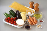 スパゲティをゆでる湯は強火にかけ、煮立てば塩を加え、パラパラとスパゲティを加える。常にクツクツ煮立っている火加減で、時々混ぜながら指定時間ゆでる。ゆで上がる2分前にトウモロコシ、サヤインゲンを加え一緒にゆでる。ザルに上げゆで汁を切る。フライパンにオリーブ油、ニンニクを入れて中火にかけ、香りがたってくれば、ナス、ズッキーニ、玉ネギ、ソーセージを加えて炒めあわせ、全体に炒め色がつけば、刻み赤唐辛子、プチトマトを加え炒めあわせ、塩コショウで味を整える。ゆであがったスパゲティ(トウモロコシ、サヤインゲン入り)を加え、全体に炒めあわせ、しょうゆを加えて全体にからめ、器に盛る。