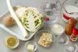カリフラワーは小房に分け、塩とレモン汁を入れた熱湯で、白く柔らかくゆでる。飾り用の小さい4房を残し、縦半分に切っておく。
