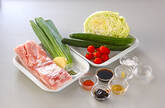 器にレタスを敷いてゆで豚を並べ、中央にふんわりキュウリを盛り、プチトマトを盛り合わせ、<ガーリックダレ>を添える。