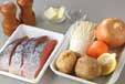 アルミホイルをにサラダ油を薄く引き、ジャガイモ、鮭、玉ネギ、エノキ、ニンジン、バターをのせ、塩コショウをふる。