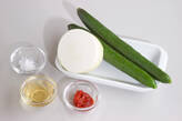 キュウリは両端を切り落とし、すりこぎなどでたたき、食べやすい大きさにさばく。