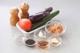 フライパンにゴマ油を強火で熱し、水切りしたナスを炒め、ナスがしんなりすれば、塩コショウをし、<合わせダレ>に加えて混ぜ合わせる。