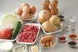 サラダ油少々で玉ネギがしんなりするまで炒め、合びき肉を加えて更に炒め肉の色が変われば、ジャガイモを加え炒め合わせ、ウスターソース、塩コショウで味を整える。
