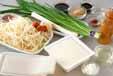 <ニラソース>のニラは水洗いし根元の硬い部分を切り落とし細かく刻む。白ネギは縦に何本か切り込みを入れて小口からみじん切りに、ショウガは皮をむいてみじん切りにし、他の<ニラソース>の材料と混ぜ合わせる。