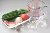 鍋にサラダ油を中火で熱してベーコンを炒め、香りが立ってくれば<スープ>を加える。