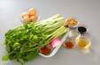 水菜、ミツバは根元を切り落とし、流水できれいに洗って3cmの長さに切り、冷水に放ってザルに上げる。