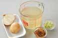 鍋にだし汁、ジャガイモ、玉ネギを入れ強火にかけ、煮立てば火を弱める。