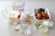 <イチゴソース>のイチゴはきれいに水洗いし、水気を拭き取る。ヘタを取って縦半分に切る。