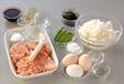 鍋に鶏ひき肉、白ネギ、<下味>を入れてよく混ぜ合わせ、弱めの中火にかける。