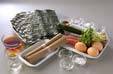 広げたそばの上にキュウリ、鶏ささ身、貝われ菜、卵焼きをのせて巻きずしの要領で具を巻く。