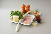 白ネギは4cmの長さに切り、縦に切り込みを入れて開き、縦にせん切りにし水に放ち、水気を絞る(白髪ネギ)。