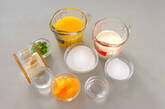 ボウルにオレンジジュース、グラニュー糖を入れてラップを掛けずに電子レンジで人肌くらいに加熱し、よく混ぜ合わせてグラニュー糖を溶かす。