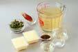 鍋にだし汁を入れて強火にかけ、煮立てば<調味料>を加える。再び煮立てば、卵豆腐、ミョウガを加える。