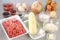 ボウルに合いびき肉、玉ネギ、パン粉、塩コショウ、ナツメグ、卵、トウモロコシを入れ、粘りが出るまで手でよく練り混ぜ合わせる。