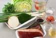 レタスはせん切りにして冷水に放り、しっかり水気をきってきれいなビニール袋に入れ、冷蔵庫で冷やしておく。