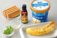 器にバニラアイスを盛り分け、バナナを添え、コーヒーリキュールを掛ける。ウエハース、あればミントの葉を添える。
