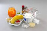 バナナは皮をむいて食べやすい大きさに切り、クコの実はサッと熱湯を掛けてしっかり水気を切り、シロップにレモン汁と合わせる。(ここではアンズのシロップ煮を使っています)