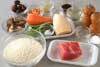米は水洗いしてザルに上げる。豚もも塊肉は1cm角に切り、<下味>をからめておく。皮をむいたニンジンとタケノコは1cm角に切る。<調味料>は混ぜ合わせておく。