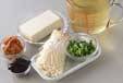 鍋にだし汁を入れて強火にかけ、煮立てば、エノキを加え、しんなりすれば豆腐を加え、みそを溶き入れる。