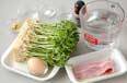 鍋にサラダ油を中火で熱してベーコンを炒め、香りが立ってくれば豆苗を加え、炒め合わせる。