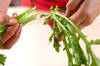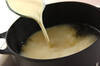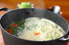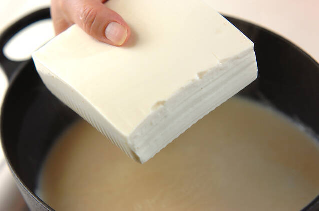 煮たつ直前に、絹ごし豆腐を1丁大きいまま鍋に入れる。少しフツフツ絹ごし豆腐が揺れだしたら、火を弱めて春菊、白ネギ、ニンジンを入れる。※<豆乳スープ>は一部取り置き(具が入る分取り置く)、具を煮ながらだし汁が減った分だけその都度足して下さい。