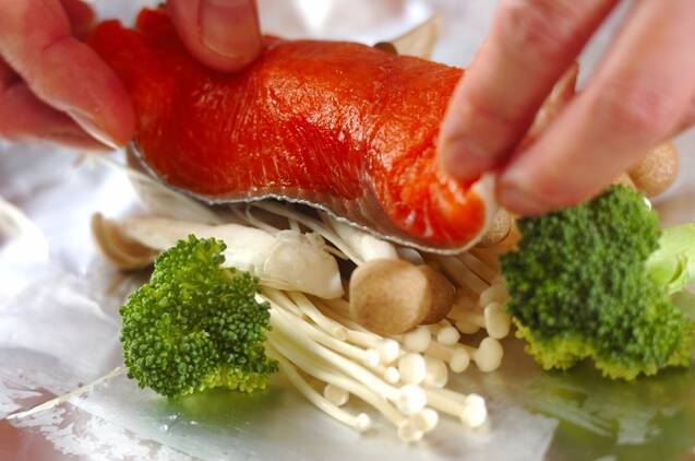 アルミホイルにバターを薄くぬり、1人分のシメジ、エノキ、ブロッコリー、鮭を置く。残りのバターをのせ、塩コショウをして包む。同じものをもう1つ作る。