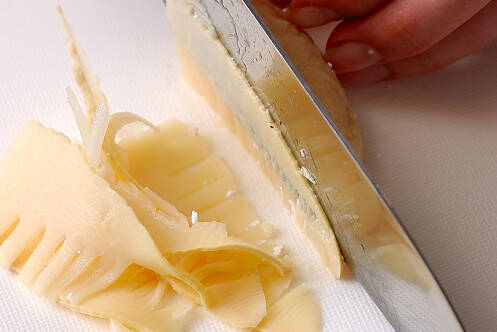 水煮タケノコは食べやすい大きさの薄切りにする。