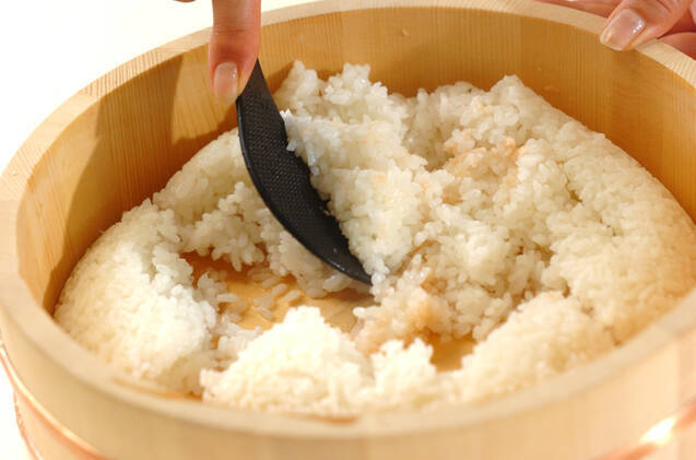 飯台に<合わせ酢>大さじ1~2を入れて全体に広げ、飯台を湿らす。炊きたてご飯を飯台にあけ、<合わせ酢>をまわしかけ、シャモジで切るように混ぜて冷ましておく。