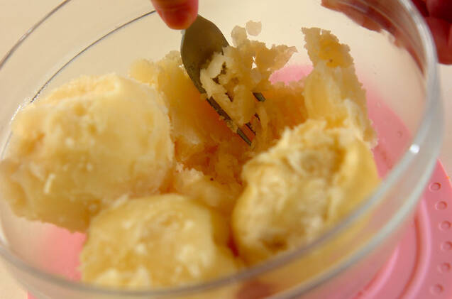 ボウルにジャガイモを入れてフォークなどでつぶし、ニンジンを加える。さらにフレンチドレッシングを加えて混ぜ合わせる。