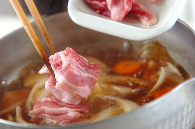 鍋にサラダ油を中火で熱し、里芋、ニンジン、玉ネギを炒め、全体に油が回ったら<合わせだし>の材料を加え、煮たったら豚バラ肉を加える。