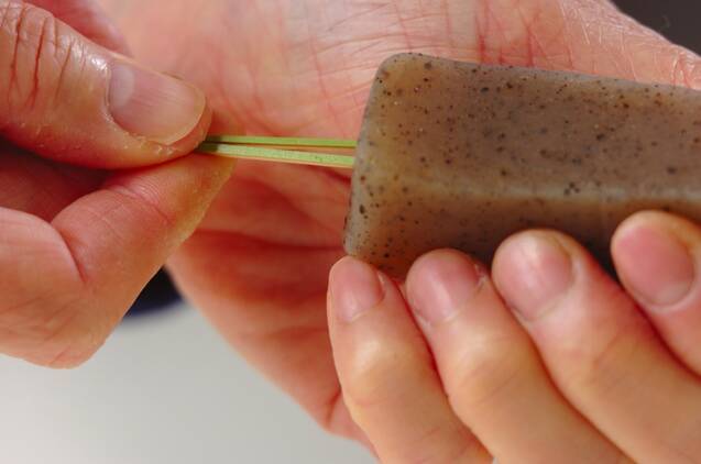 板コンニャクは幅2cmに切り、水からゆで、煮たったらザルに上げる。串を刺す。