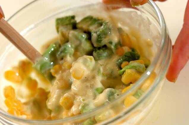 ボウルで<衣>の材料を混ぜ合わせ、水煮コーン、アボカドを加え、全体にまとまとまるくらいに合わせる。