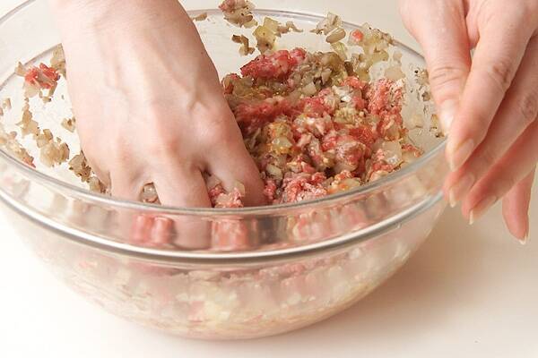 ボウルに合いびき肉、炒めた玉ネギ+マイタケ、パン粉、牛乳、生クリーム、卵、塩コショウ、ナツメッグを入れ、よく粘りが出るまで手で混ぜ合わせる。