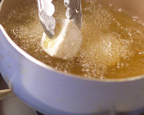 ジャガイモ2個は皮ごときれいに水洗いし、4等分して耐熱容器に並べ、ラップをして電子レンジに3~4分かける。柔らかくなれば、塩コショウを軽く振りかけ、小麦粉を薄くつけ、170℃の揚げ油で素揚げにする。