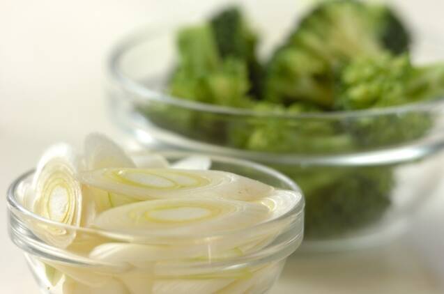 白ネギは斜め薄切りにする。ブロッコリーは小房に分ける。