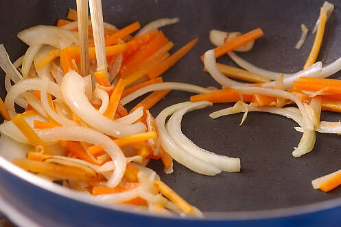 深めのフライパン又は中華鍋にサラダ油、ニンニク、ショウガを入れ、中火にかける。香りが立ってきたら玉ネギとニンジンを加えて、炒め合わせる。