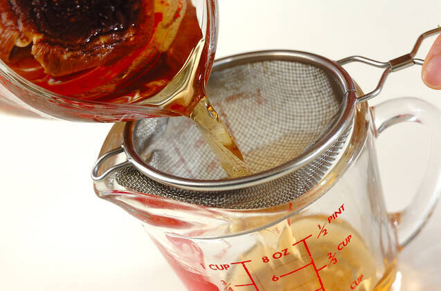 シイタケはぬるま湯で柔らかくもどし、軸を取って半分に切る。もどし汁はこして80ml取っておく。