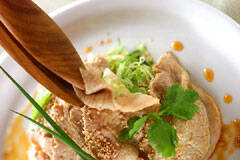 豚肉がメインのお料理とおもいきや、薄切り肉の下にはたっぷりのせん切りサラダが隠れています!暑い季節に美味しい冷シャブにして、ニンニク風味のドレッシングがポイント。