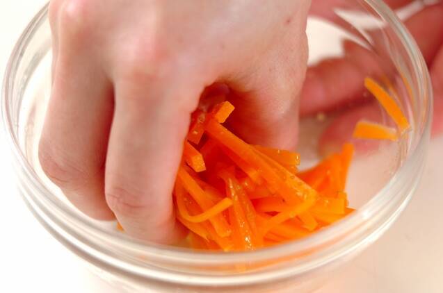 熱湯にモヤシを入れてサッとゆで、ザルに上げる。続けてニンジンもゆで、ザルに上げる。それぞれ塩コショウをしてゴマ油をもみ込む。