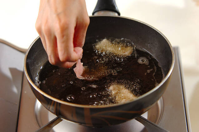 豚肉は長さ2cmに切り、<下味>の材料をもみ込んでおく。豚肉1枚ずつに片栗粉をまぶし、170℃の揚げ油でこんがり揚げる。