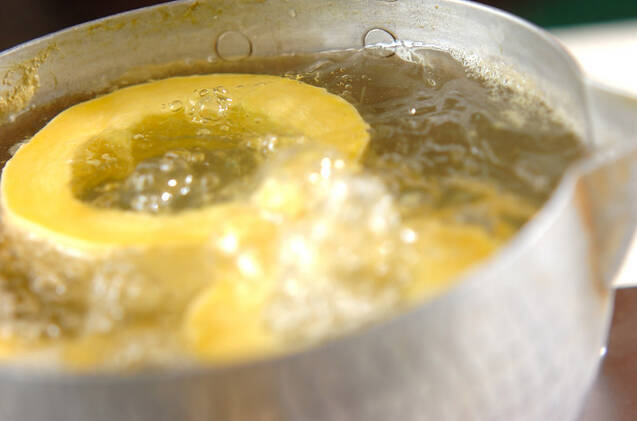 そうめんカボチャは両端を切り落とし、3~4つの輪切りにして、スプーンなどで種を取る。たっぷりの熱湯に入れて10分ゆでる。竹串がスッと刺さったらOKです。水に取り、水を替えながら冷ます。皮はとても固いので、輪切りにする時は注意して下さい。