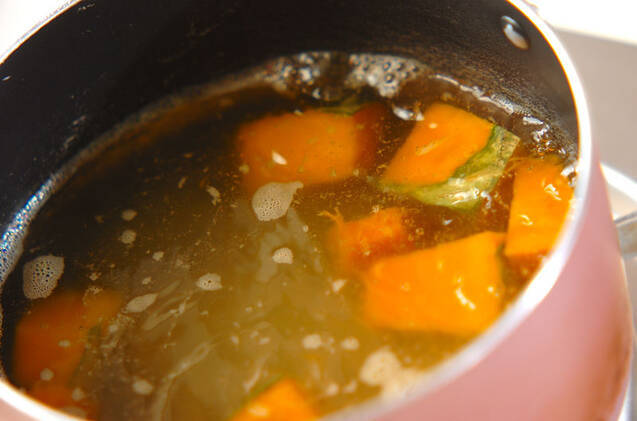 鍋にだし汁、カボチャを入れて強火で熱し、煮たったら火を弱めて柔らかくなるまで煮る。
